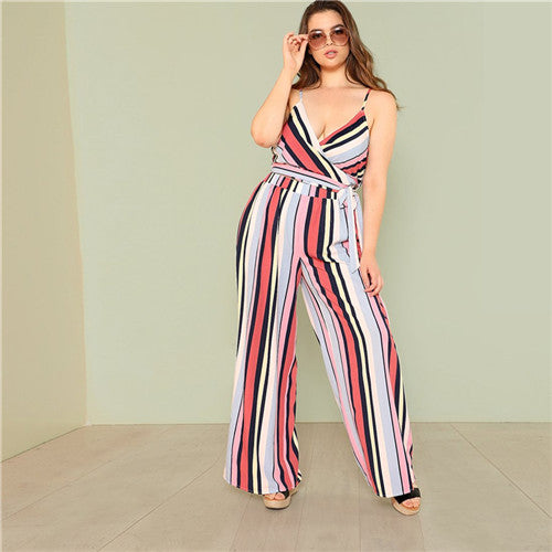 SHEIN Two Piece Set Summer Women Surplice Neck Print Top & Pants 2018 Striped Cami Top & Culotte Pants Set Plus Size Twopieces
