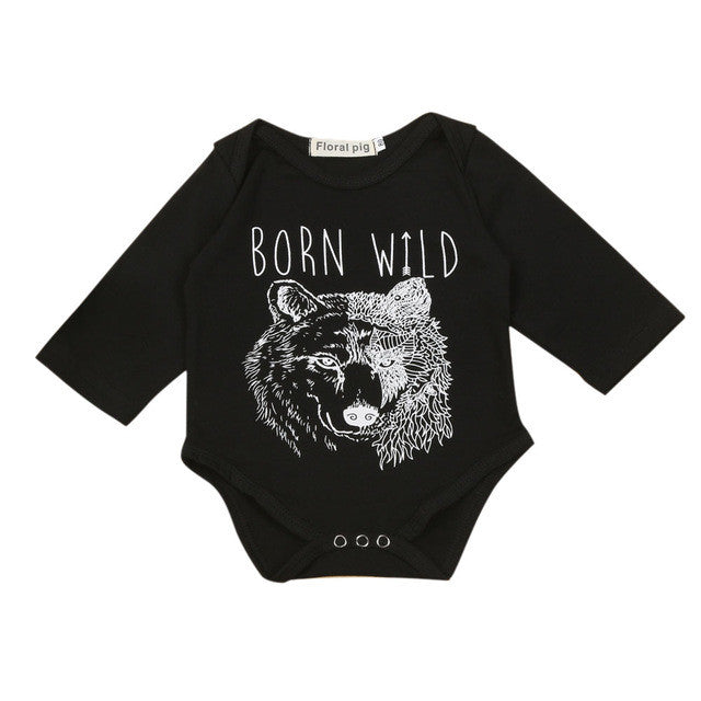 2017 Fashion baby boy clothes Newborn Infant Baby Boys Long Sleeve Wolf Print Letter T-Shirt black Romper Jumpsuit "BORN WILD"